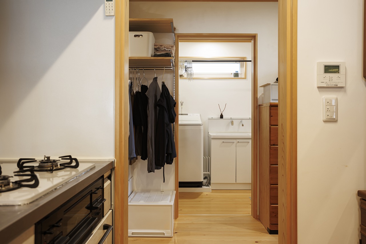 キッチンからは脱衣室が見通せるため、洗濯のタイミングも一目でわかります。